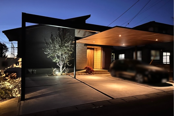カーポートFⅡ2台用の照明(ダウンライト)の推奨個数は4個ですが、夜でも十分に明るく照らし、お車を含めた外構空間を美しく演出されている良い現場事例となりました。