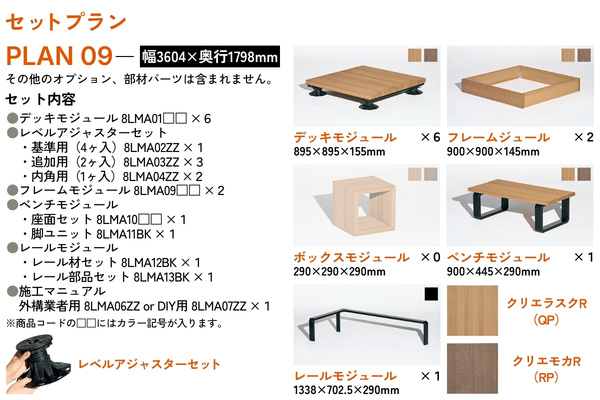 | セット内容 | 【セット内容】 ●デッキモジュール 8LMA01□□ ×6セット ●レベルアジャスターセット 基準用(4ヶ入)8LMA02ZZ ×1セット ●レベルアジャスターセット 追加用(2ヶ入)8LMA03ZZ ×3セット ●レベルアジャスターセット 内角用(1ヶ入)8LMA04ZZ ×2セット ●フレームモジュール 8LMA09□□ ×2セット ●ベンチモジュール 座面セット 8LMA10□□ + 脚ユニット 8LMA11BK ×1セット ●レールモジュール レール材セット 8LMA12BK + レール部品セット 8LMA13BK ×1セット ●施工マニュアル 外構業者用 8LMA06ZZ or DIY用 8LMA07ZZ ×いずれか1セット ※商品コードの□□にはカラー記号が入ります。 ※レベルアジャスターセットには「高さ延長材」がレベルアジャスターと同数入っています。 |